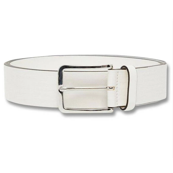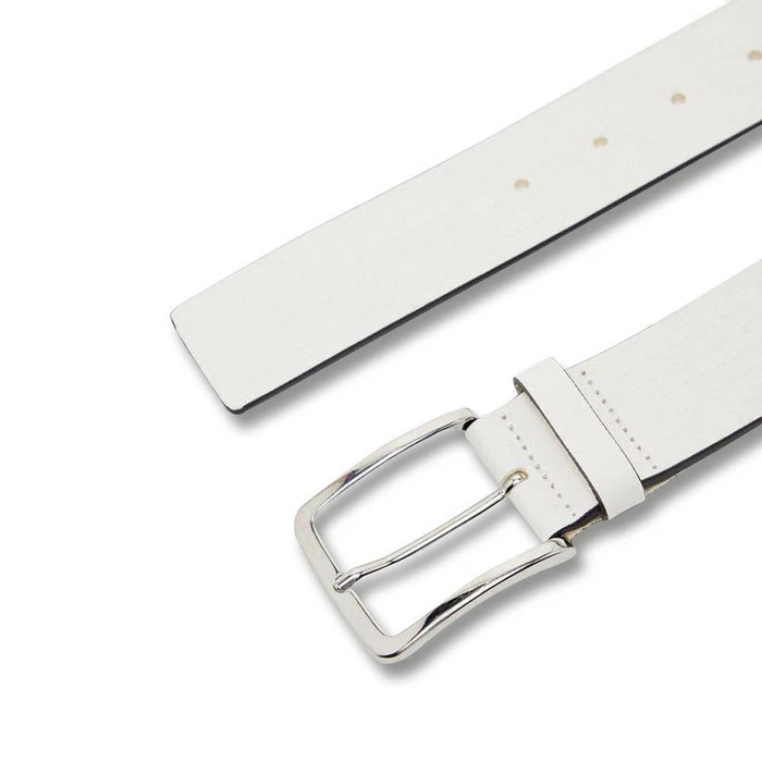 Leather belt with an embossed all-over print artwork and contrast color edge.
